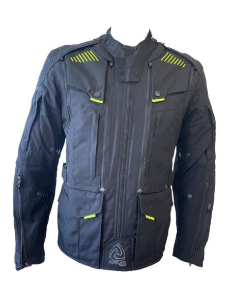 * Chaqueta touring para hombre de corte largo tipo 3/4.* Triple forro desmontable de lluvia y frío.* Confeccionada en Poliéster 600D.* Parte frontal y trasera desmontable convirtiéndola en una cazadora de verano totalmente transpirable.* Protecciones extraíbles en codos, hombros y espalda.* Botones ajustables en el brazo.* Grandes bolsillos exteriores.* Cinturón ajustable en cintura.* Puños ajustables con cremallera y velcro.* Reflectante para mejorar la visibilidad nocturna.* Fuelle para mayor comodidad en hombros y codos.* Cremallera frontal con doble posición de verano/invierno.* Cierres en cuello y bolsillos magnéticos.* Material elástico en el antebrazo.* Chaqueta 4 estaciones con HOMOLOGACIÓN CE.* Tallas: S a 2XL