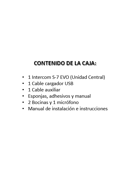 Unidad pequeña y compacta con funciones simples, fácil de usar* Alcance máximo, distancia de conexión de 100 metros* Ideal para pasajero a pasajero o para montar cerca de otro pasajero* Permite responder, rechazar, colgar y efectuar rellamada* Contra lluvia y polvo* Compatible con sistemas IOS Y Android* Bluetooth V5.0, QCC chipset* Tiempo de espera de 120 horas* Uso continuado de 8 horas* Tiempo de carga completa de 2 horas* Conexión USB* Batería Li-ion 3.7v/200mAh* Se puede conectar un teléfono móvil y otro dispositivo Bluetooth como música o GPS* Incluido en la caja todo lo necesario para su uso.* Descargar Manual de instrucciones en español: https://drive.google.com/file/d/1zU2c1xgDlFxYlhRrx-FYG5OWu7BjVWiy/view?usp=share_link