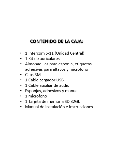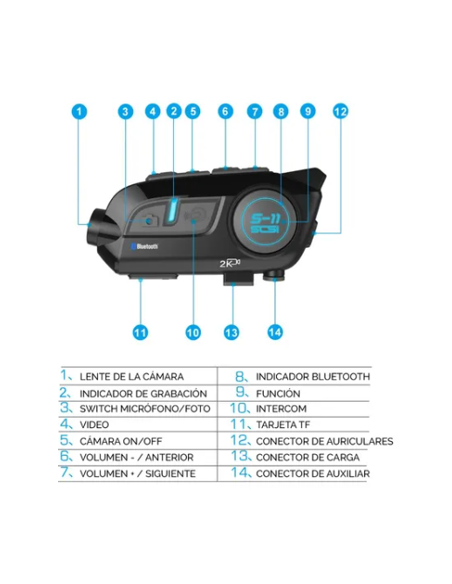Unidad pequeña y compacta con funciones simples, fácil de usar* Alcance máximo, distancia de conexión de 800 metros* Admite conexión en grupo de hasta 4 pasajeros* Permite responder, rechazar, colgar y efectuar rellamada* Contra lluvia y polvo* Compatible con sistemas IOS Y Android y todo tipo de casco* Resolución de grabación cámara y vídeo: 1080P/1440P (2K)* Bluetooth V5.0, CSR chipset* Tiempo de espera de 15 días* Uso continuado sin grabación de 25 horas* Uso continuado con grabación de 6,5 horas* Tiempo de carga completa de 2,5 horas* Batería Li-ion 2000mAh* Se puede conectar un teléfono móvil y otro dispositivo Bluetooth como música o GPS* Incluido en la caja todo lo necesario para su uso.* Descargar Manual de instrucciones en español: https://drive.google.com/file/d/1zJOrQP43BCpWOHIaml9GqeXj8kgZkaXy/view?usp=share_link